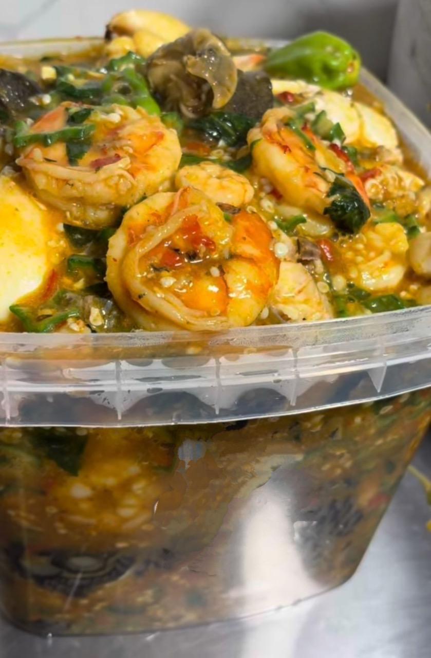 Fresh okra cooked with a mix of seafood in a spicy, richly seasoned sauce. Thick, hearty, and perfect with banku or fufu